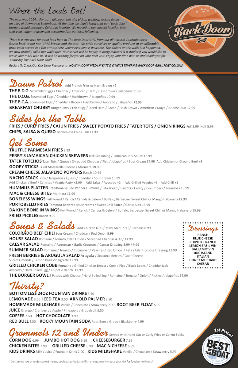 Welcome to Back Door Grill, a hidden gem nestled in Steamboat that's turning heads and tantalizing taste buds. This casual eatery embodies a laid-back vibe, welcoming you with open arms and a robust menu that has food lovers buzzing. The atmosphere is lively, adorned with dollar bills festooned along the walls, each one a canvas for creativity, as visitors are invited to design and hang their own. It’s this quirky charm that sets Back Door Grill apart, making your dining experience not just about the food, but the memories you’ll create.